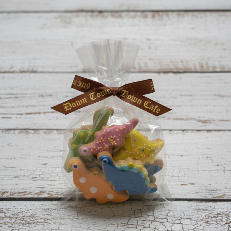 恐竜 バタークッキーです。サクッとした食感と、豊かなバターの風味が楽しめるこのクッキーは、DOWN TOWN CAFE バタークッキーと同じ生地を恐竜の型で抜いてあります。